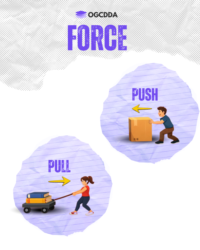 Force is defined as a push or a pull that can change the state of rest or motion of an object, or change its shape. This definition focuses on the observable effects of force rather than its internal nature. Since force itself cannot be seen, its presence is always inferred from the changes it produces in an object.